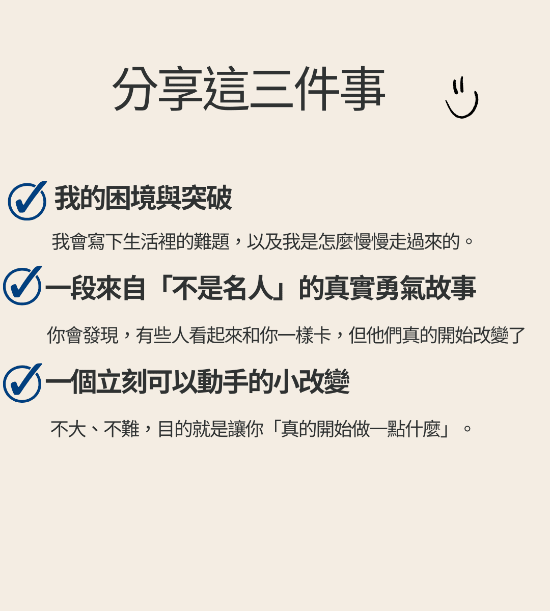 | 真實共鳴 | 太理想/太專家 | 來自生活裡卡住過、但真的站起來的人 |